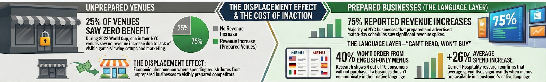 ⚠️ The 25% that saw nothing. In the NYC Hospitality Alliance's post-tournament survey after Qatar 2022, roughly one in four venues reported no meaningful revenue increase — despite WC traffic surging all around them. The common thread: no game-showing setup, no visible fan-facing signage, no match-schedule promotion. The World Cup does not automatically benefit everyone. Preparation determines who captures it.