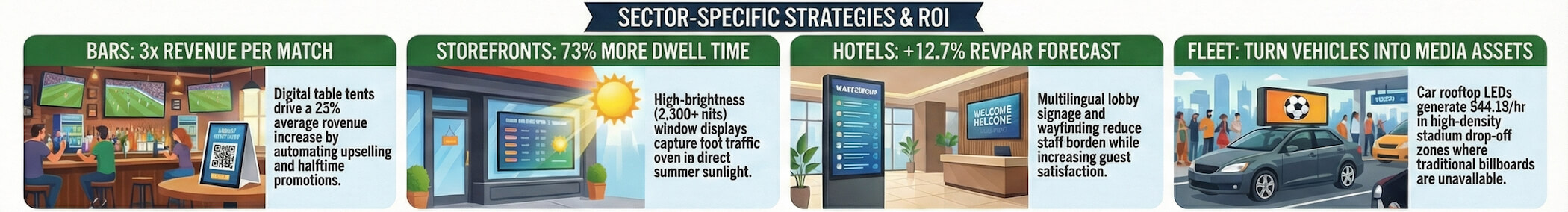 Taxi companies, shuttle operators, and fleet vehicles will run at maximum capacity throughout the tournament. For operators who own vehicles, rooftop LED displays become valuable advertising inventory at the exact moment when rider volume in host cities is highest. A category with virtually no existing guidance — and significant untapped opportunity.