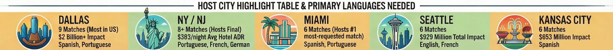 | City | Matches | Projected Impact | Key Match | Primary Fan Languages |